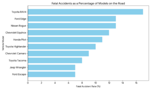 Want to know what the most dangerous vehicles on the road are? Maison Law, a law firm that handles auto accidents and injuries published a list of the vehicles that showed the greatest increase in fatal accidents in the U.S. from 2019 to 2023. Not surprisingly, the Chevrolet Silverado, along with the Toyota Camry and Corolla, and Honda Accord and Civic showed the biggest increase. I say not surprisingly because there’s so many of those vehicles on the road that it’s kind of obvious they’d get in more accidents. So we asked Maison Law to run the numbers again, but to look at fatal accidents as a percentage of models on the road. And here’s what they came up with. The Toyota RAV4 tops the list, followed by the Nissan Rogue, Ford Edge, Chevrolet Equinox and Honda Pilot, to name the top 5. And the data that jumps off the page for us is that they’re all crossovers.