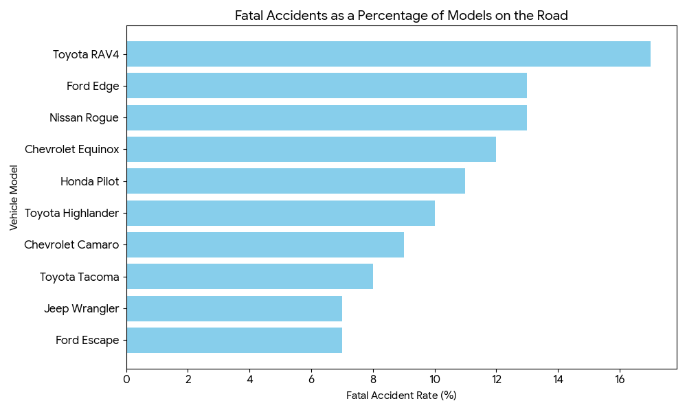Want to know what the most dangerous vehicles on the road are? Maison Law, a law firm that handles auto accidents and injuries published a list of the vehicles that showed the greatest increase in fatal accidents in the U.S. from 2019 to 2023. Not surprisingly, the Chevrolet Silverado, along with the Toyota Camry and Corolla, and Honda Accord and Civic showed the biggest increase. I say not surprisingly because there’s so many of those vehicles on the road that it’s kind of obvious they’d get in more accidents. So we asked Maison Law to run the numbers again, but to look at fatal accidents as a percentage of models on the road. And here’s what they came up with. The Toyota RAV4 tops the list, followed by the Nissan Rogue, Ford Edge, Chevrolet Equinox and Honda Pilot, to name the top 5. And the data that jumps off the page for us is that they’re all crossovers.